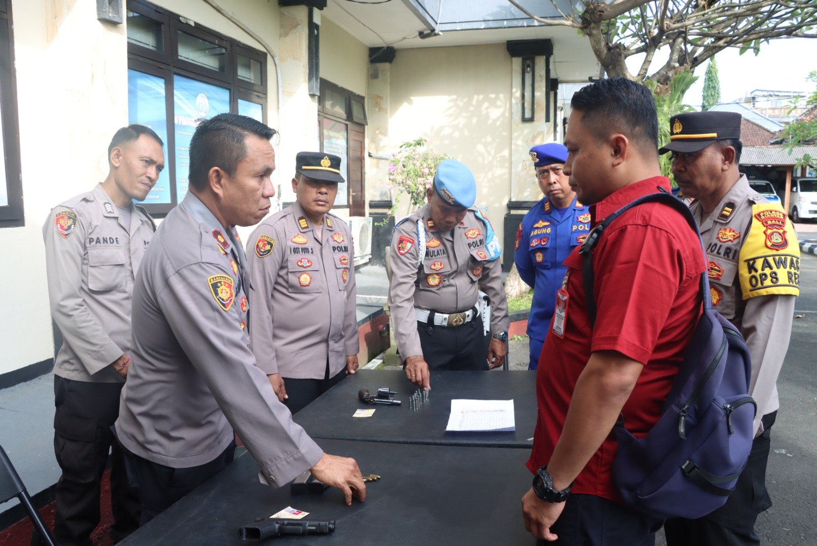 Pemeriksaan senpi di Polres Gianyar dipimpin Wakapolres Gianyar Kompol Yusak Agustinus Sooai, SIK didampingi  Kabaglog Polres Gianyar AKP I Gusti Putu Suarjaya dan  Kasi Propam Iptu Made Mulata.