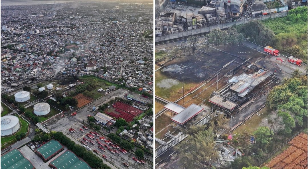 Kondisi Depo Pertamina Plumpang Koja, Jakarta Utara dan pemukiman padat penduduk di sekitarnya pascakebakaran hebat yang menewaskan 14 orang dan puluhan warga terluka terjadi pada Jumat malam, 3 Maret 2023. (Kolase: Divhumas Polri/Anw)