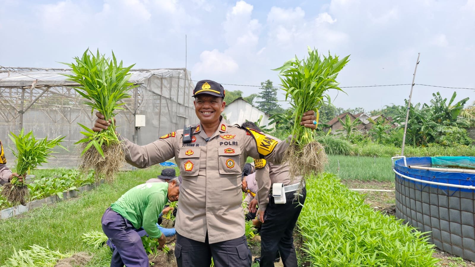 Foto: Kapolsek Balongbendo AKP Sugeng Sulistiyono saat panen kangkung. (barometerbali/redho)