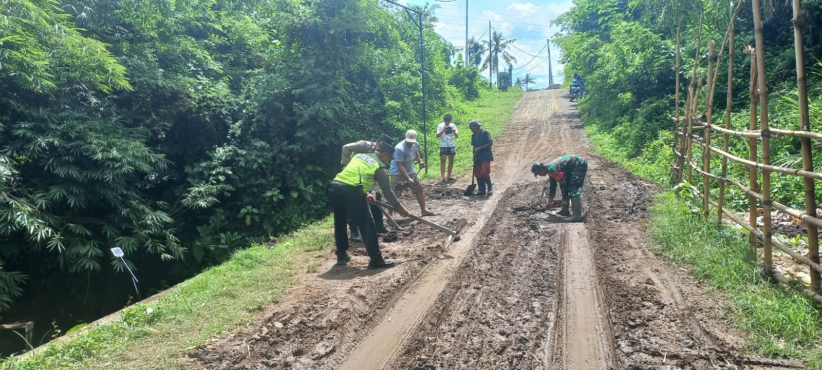 Kapolsek Banjarangkan AKP I Wayan Sujana menerjunkan anggota Unit Samapta bersinergi dengan perangkat Desa Negari, masyarakat, dan TNI menuju lokasi untuk membantu membersihkan sisa tanah liat longsoran di jalan di atas Beji Salikerta, Desa Negari, Kecamatan Banjarangkan, Klungkung, Jumat (7/4/2023). (Foto: Polres Klk/Ags)