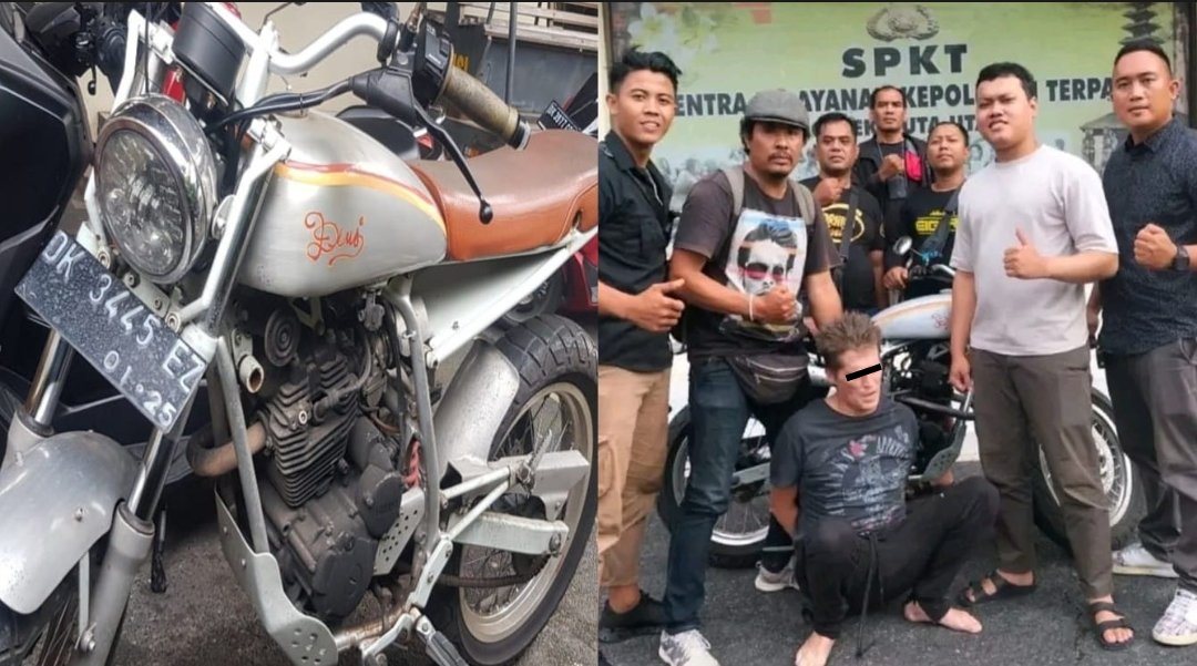 Foto kolase: Team Opsnal Polsek Kuta Utara (kanan) meringkus pencuri sepeda motor Yamaha Scorpio (kiri) WNA asal Inggris, Gilles Thomas Allcard William (43) kurang dari 8 jam di Jl. Tegalsari, Canggu, Kuta Utara, Senin, (28/11/2022). (hms/res/bdg)