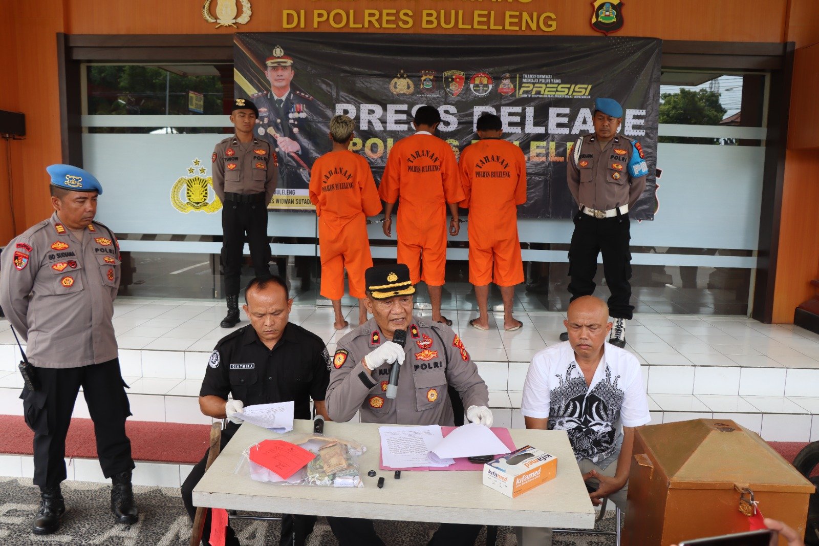 Buleleng | barometerbali – Seizin Kapolres Buleleng AKBP Ida Bagus Widwan Sutadi, Kapolsek Singaraja Kompol Gede Juli didampingi Kasihumas Polres Buleleng AKP I Gede Darma Diatmika, serta Kasipropam Polres Buleleng AKP I Gede Sudiana, menggelar press release terkait pengungkapan kasus pencurian dengan pemberatan (curat) di lobi Polres Buleleng pada Senin (3/2/2025).