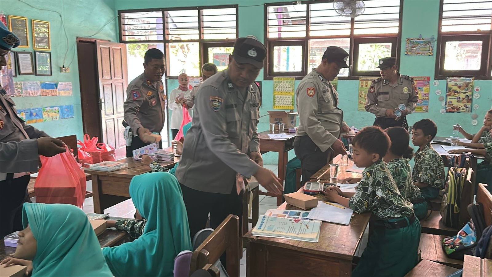 Kedatangan rombongan polisi dengan membawakan makan siang gratis ke sekolah, disambut senyum mengembang dan penuh ceria siswa-siswi.