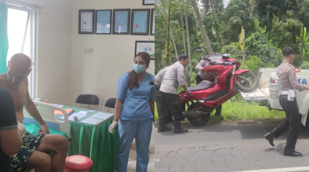 RAWAT: WNA mendapat perawatan medis (kiri) dan personel Polsek Tembuku (kanan) mengamankan sepeda motor korban yang mengalami kecelakaan tunggal di jalan umum perbatasan Desa Bangbang dengan Desa Undisan, Bangli, Sabtu (25/2/2023). (Kolase: BB/Hms Polres Bangli/Srt)