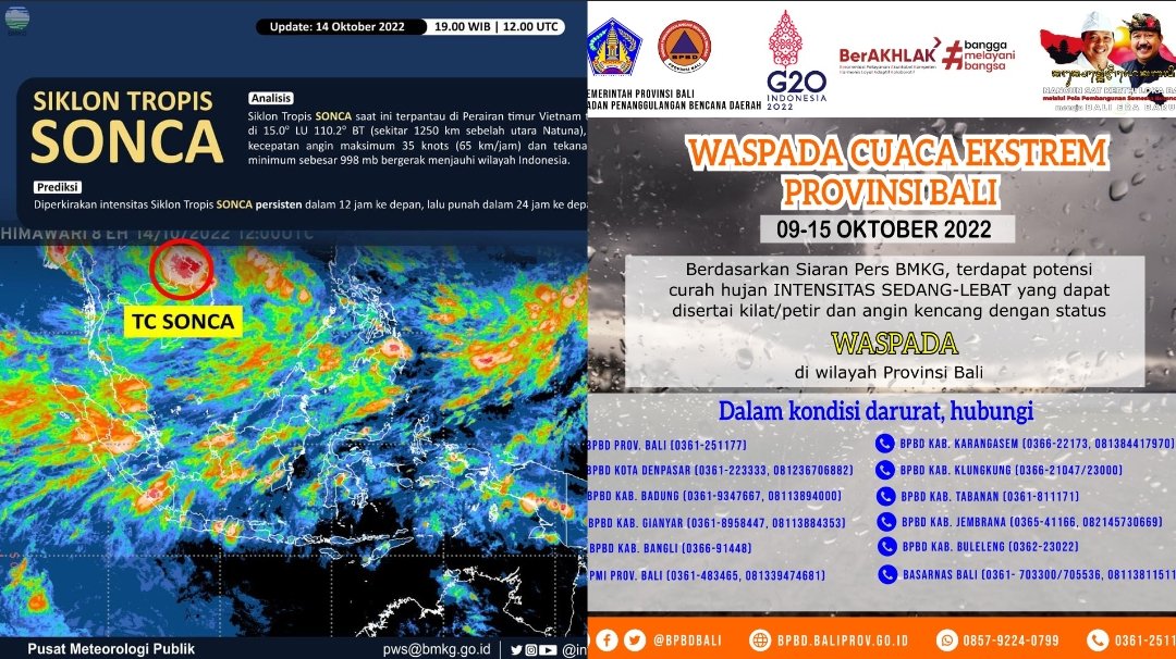 Ket foto: BMKG memperingatkan lebih dini waspada potensi cuaca ekstrim dalam sepekan ini hingga 21 Oktober 2022 (kiri) dan dalam kondisi darurat masyarakat Bali dapat menghubungi nomor penting tersebut (kanan). (BB/db)