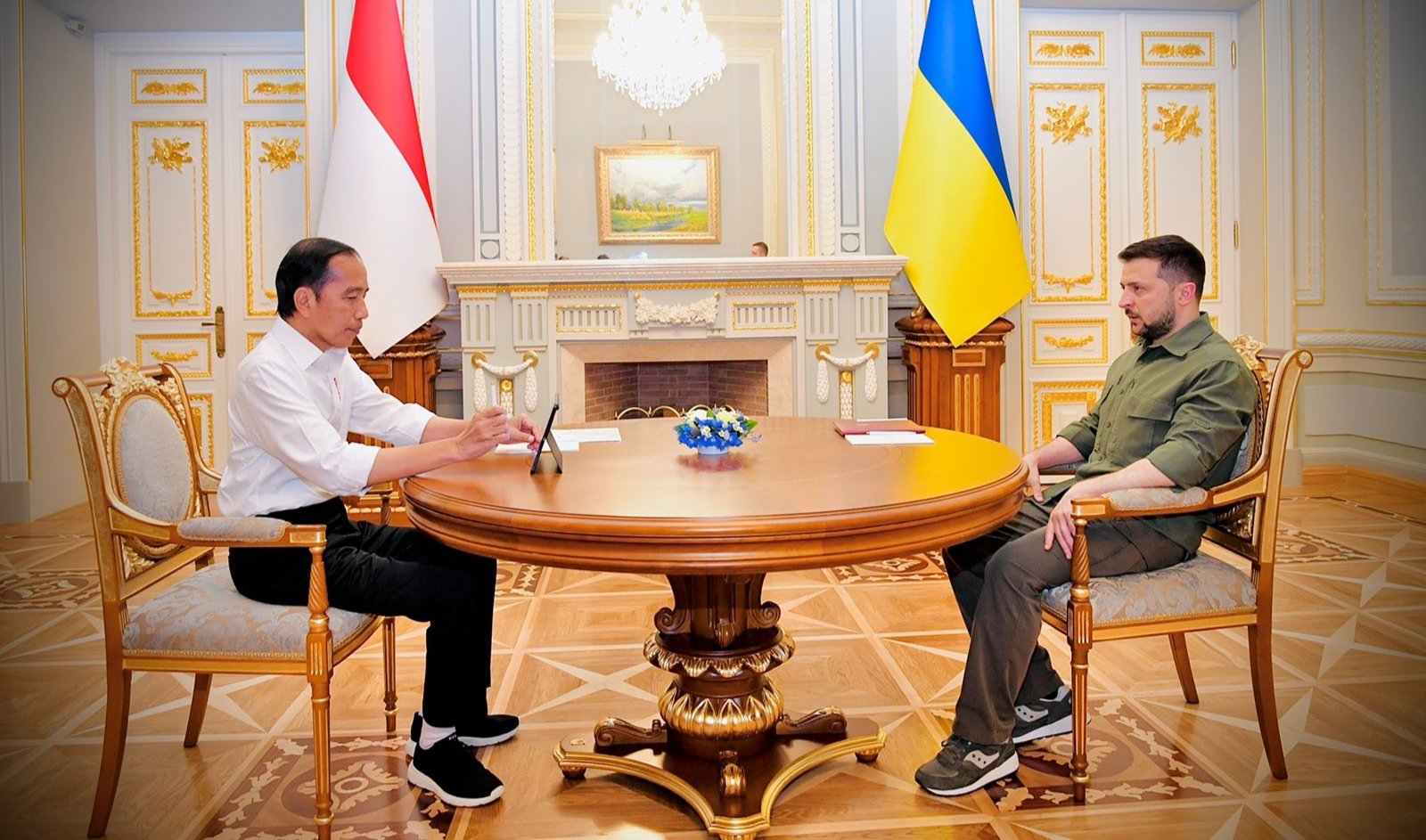 Presiden Joko Widodo mengadakan pertemuan dengan Presiden Ukraina, Volodymyr Zelenskyy, di Istana Maryinsky, Kyiv, Ukraina, pada Rabu, 29 Juni 2022. Dalam pertemuan tersebut, Presiden Jokowi menyampaikan bahwa kunjungannya ke Ukraina merupakan perwujudan kepedulian masyarakat Indonesia untuk Ukraina.