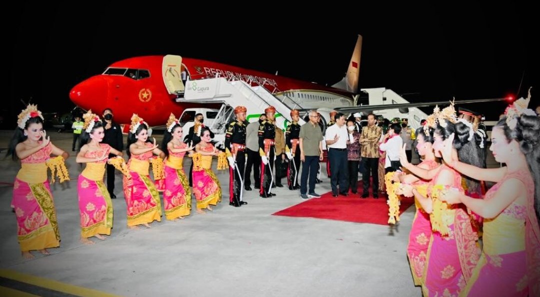 Setibanya di Bandara Internasional I Gusti Ngurah Rai, Kabupaten Badung, Presiden dan Ibu Iriana disambut layaknya penyambutan resmi pemimpin negara G20. Turun di tangga pesawat, Presiden disambut pasukan jajar kehormatan dan tarian Bali di area tarmak.