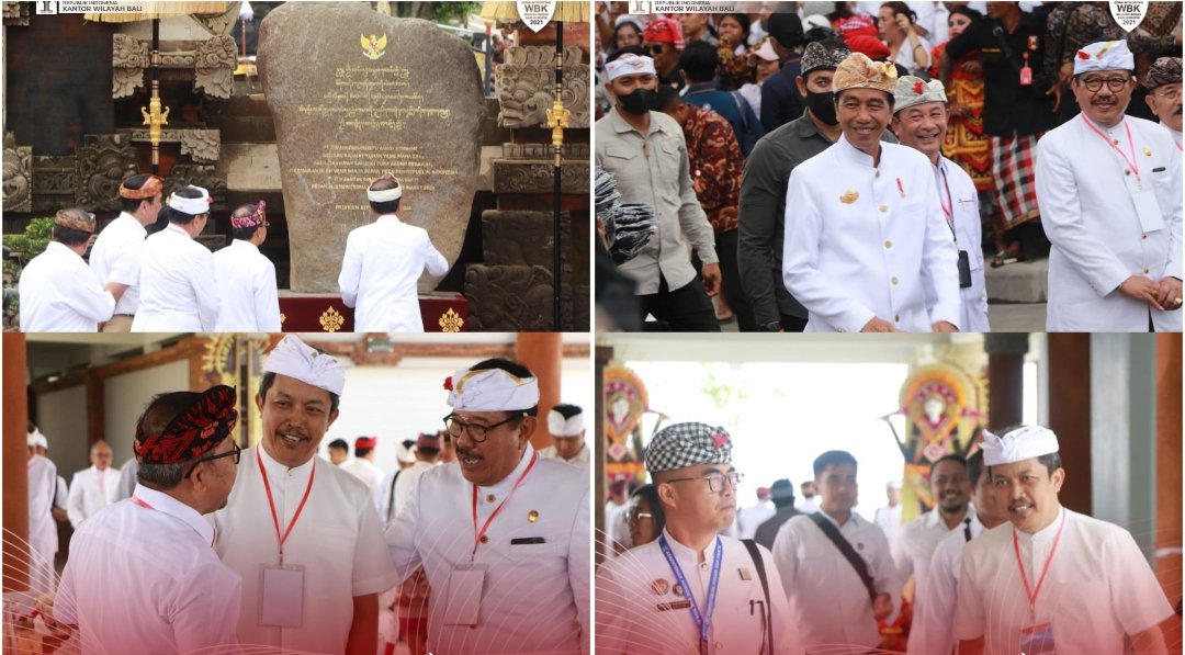 Presiden Republik Indonesia, Ir. Joko Widodo (Jokowi) meresmikan fasilitas kawasan Suci Pura Agung Besakih, Karangasem, ditandai dengan penandatanganan Prasasti di depan bangunan Candi Bentar Margi Agung, dilanjutkan meninjau langsung fasilitas kawasan Pura terbesar di Bali ini, Senin (13/3/2023). (Kolase: BB/Kumham Bali/Sdn)