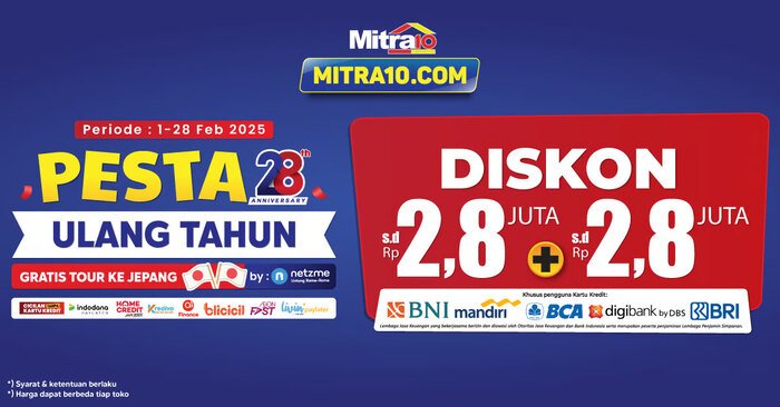 Dalam rangka merayakan 28 tahun perjalanan Mitra10, pelanggan dapat menikmati promo-promo menarik selama periode 1 – 28 Februari 2025 di seluruh toko Mitra10 dan juga di Mitra10.com. Berikut adalah beberapa penawaran spesial yang bisa didapatkan: