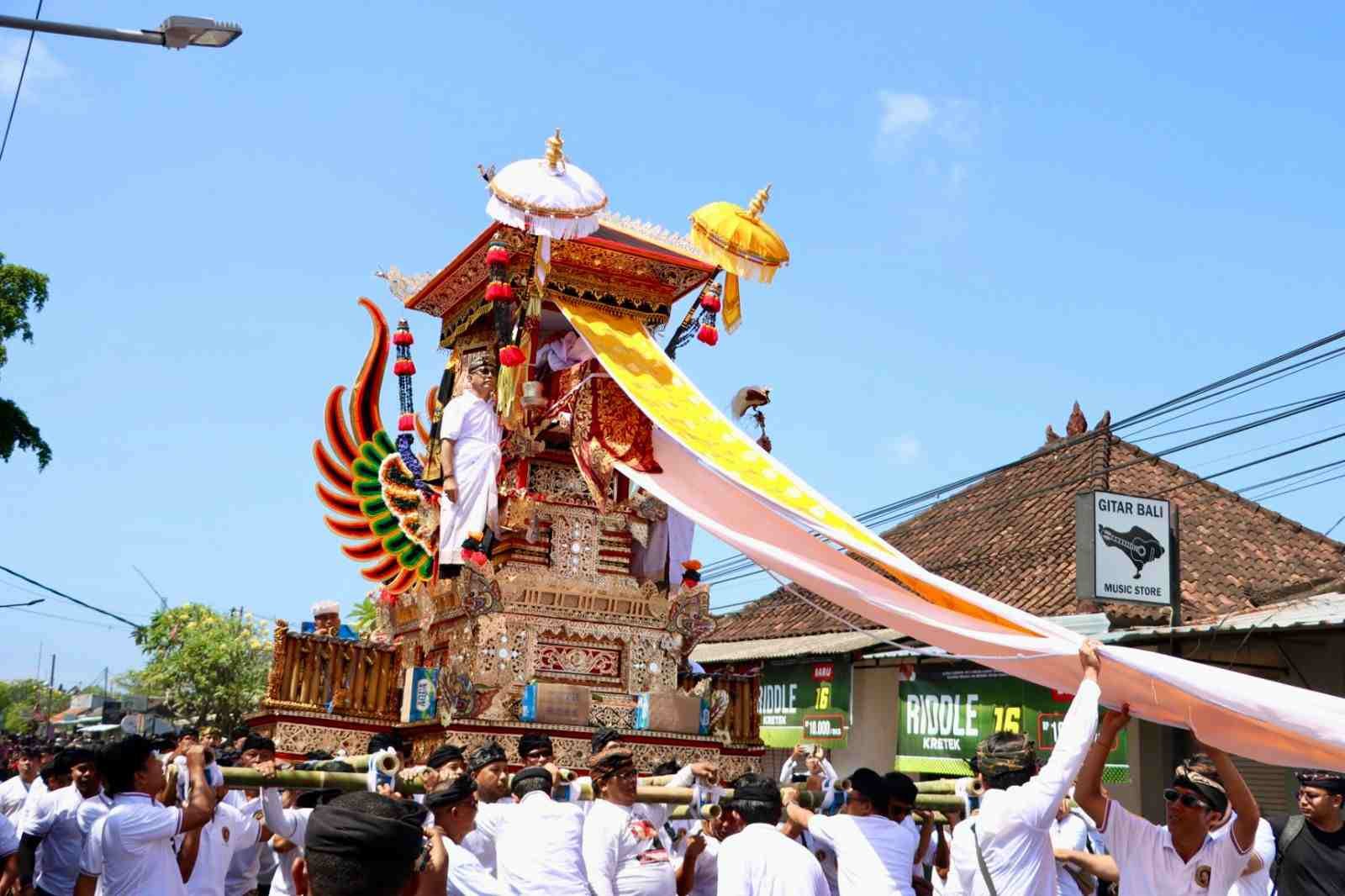Dalam balutan cuaca cerah disepanjang Jalan Padma Penatih, rangkaian bergerak menuju pusat upacara di Setra Desa Adat Peninjoan. Dimana, setelah rangkaian pelebon, upacara dilanjutkan dengan Nganyut ke Segara Padanggalak.
