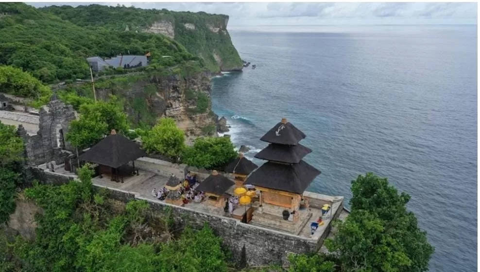 Pura Luhur Uluwatu di Kuta Selatan, Badung, Bali, tampak dari atas dengan pesona keindahan laut lepas di ujung tebing. (barometerbali/dok.istimewa)