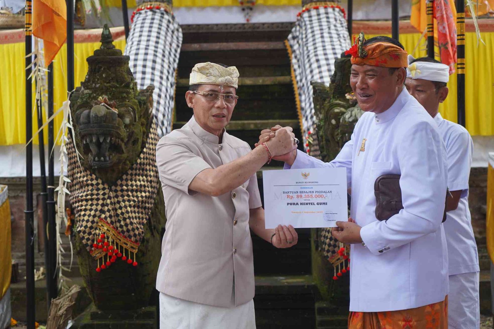 Barometer Bali | Klungkung – Bertepatan dengan rahina suci Purnama Kelima, Bupati Klungkung I Made Satria bersama Wakil Bupati Tjokorda Gde Surya Putra menghadiri puncak Upacara Karya di lima pura besar. Dimulai upacara Ngusaba Jagat Pura Agung Kentel Gumi, Desa Tusan Kecamatan Banjarangkan, Rabu (5/11). Kehadiran Bupati Satria dan Wabup Tjok Surya ini disambut para prajuru adat dan dinas Desa Banjarangkan, Camat serta sejumlah anggota DPRD Klungkung dapil Banjarangkan.