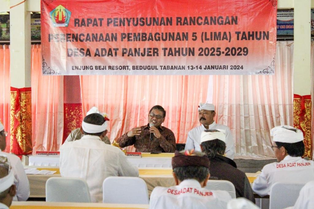 “Diharapkan dari kegiatan ini tersusun dokumen rancangan perencanaan pembangunan lima tahun desa Adat Panjer tahun 2025 – 2029. Sehingga dengan adanya kegiatan ini akan memunculkan sinkronisasi dalam mendukung pembangunan di berbagai sektor. Saat ini Bali memiliki dua sistem yakni sistem adat dan kedinasan, hal inilah yang perlu disinkronkan melalui kegiatan ini sehingga pola pembangunan tidak tumpang tindih,” paparnya panjang lebar.