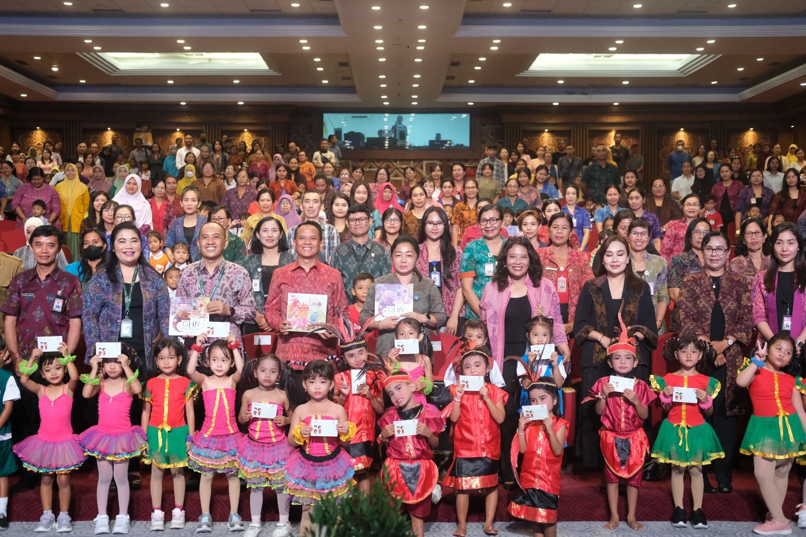 Ket foto: Walikota Denpasar, I Gusti Ngurah Jaya Negara, Bunda PAUD Kota Denpasar, Ny. Antari Jaya Negara, Ketua GOW Kota Denpasar, Bunda PAUD Kota Denpasar, Ny. Sagung Antari Jaya Negara, dan Ketua GOW Kota Denpasar, Ny. Ayu Kristi Arya Wibawa, Direktur Utama Bank BPD Bali, I Nyoman Sudharma bersama anak anak TK se Kota Denpasar, dalam kegiatan Edukasi Keuangan Sejak Dini, di Gedung Dharma Negara Alaya, Senin (29/7). (Sumber: barometerbali/win)