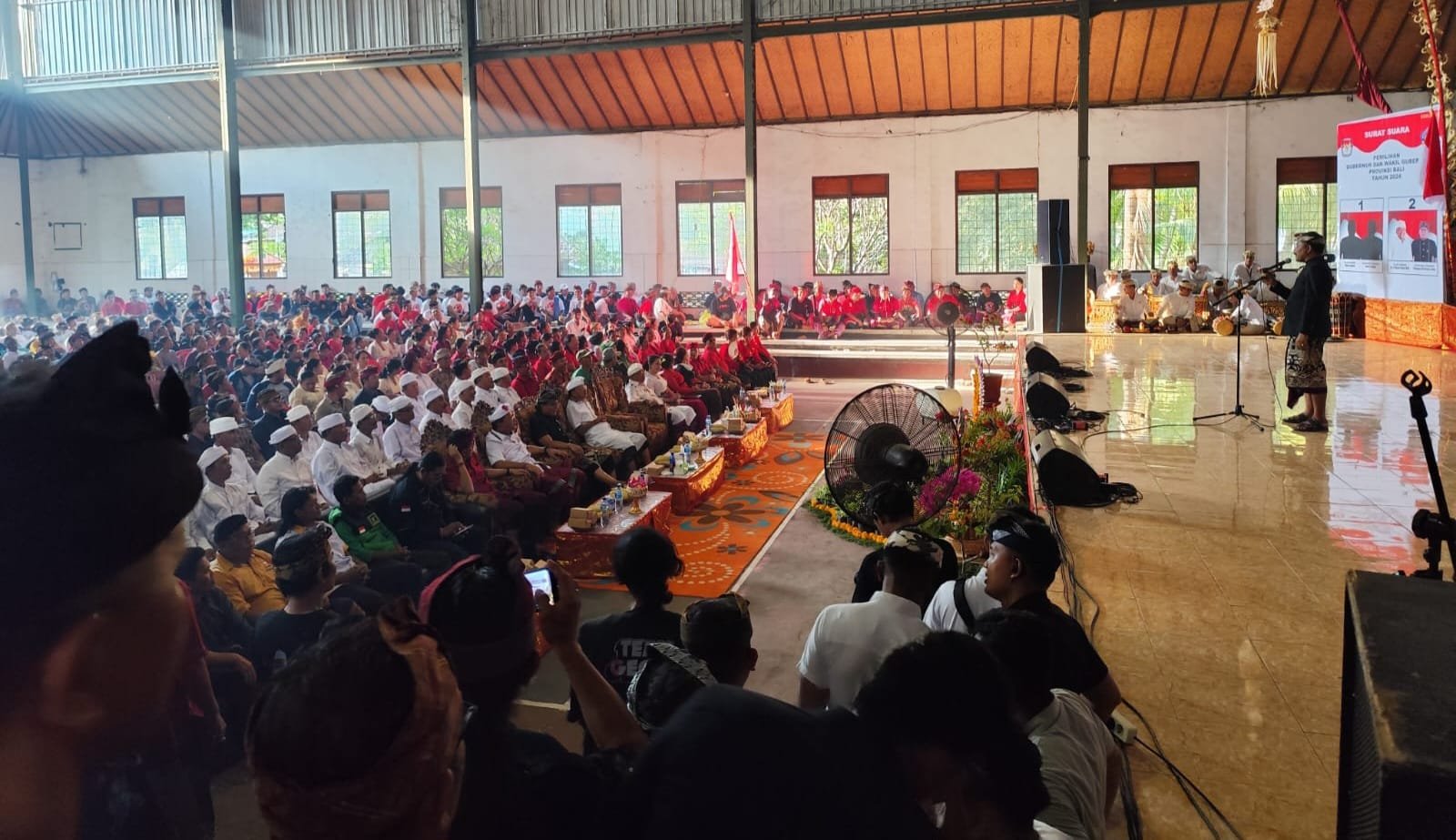 “Janji nggih kita jadikan pesta demokrasi ini riang gembira,” seru Giri Prasta mengajak hadirin.