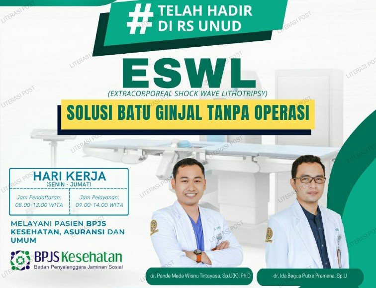 ESWL merupakan pelaksanaan non-operatif atau tanpa operasi untuk memecahkan batu ginjal dengan menggunakan gelombang kejut (shock wave). Tindakan ESWL dapat dilakukan di RS Unud dibantu oleh Dokter Spesialis Urologi yaitu dr. Ida Bagus Putra Pramana, Sp.U dan dr. Pande Made Wisnu Tirtayasa, Sp.U(K), Ph.D.