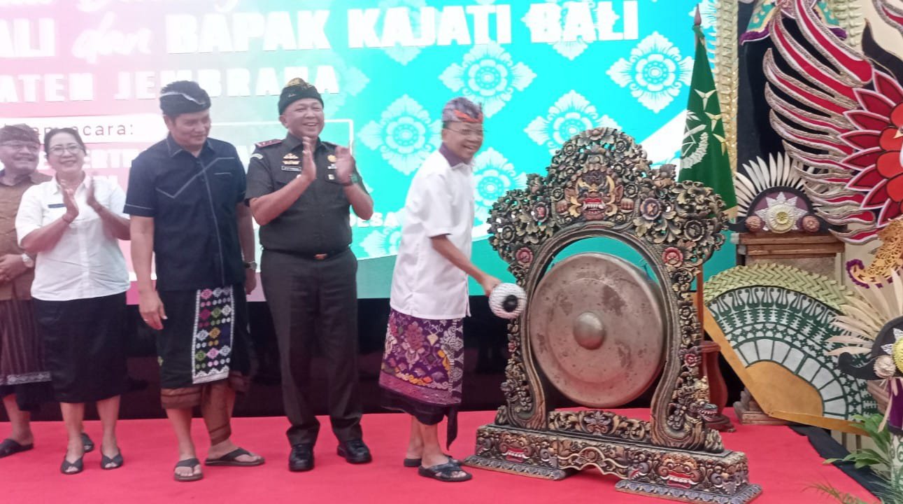 Gubernur Bali, Wayan Koster memukul gong sebagai tanda meresmikan Bale Kertha Adhyaksa di Kabupaten Jembrana, Senin (11/6/2025), sebagai ruang baru bagi penyelesaian sengketa hukum berbasis adat atau Restorative Justice (RJ) di gedung Kesenian Ir Soekarno di Jembrana, Rabu (11/6/2025). (barometerbali/red)