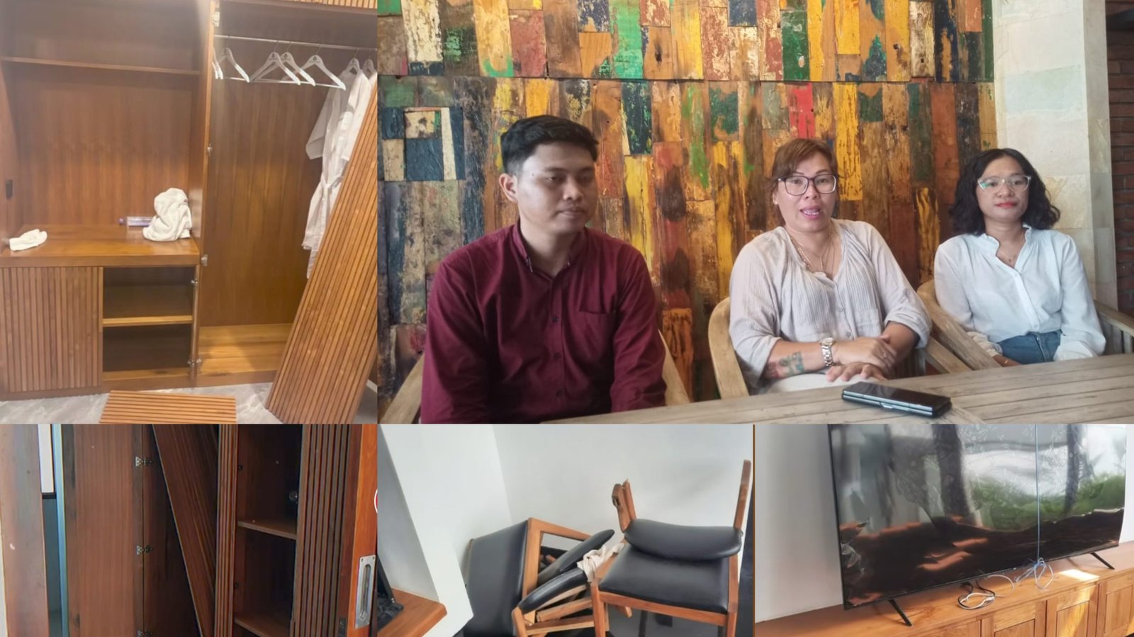 Kolase foto: Esther Hariandja, SH (tengah) selaku kuasa hukum pemilik vila di Canggu yang diduga dirusak WN Rusia inisial AS dan kondisi kerusakan kamar vila. (Sumber: BB/Dyt)