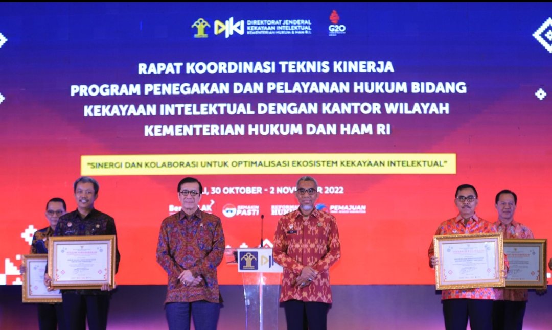Penghargaan itu disampaikan secara simbolis dalam Rapat Koordinasi Teknis Kinerja Program Penegakan dan Pelayanan Hukum Bidang Kekayaan Intelektual di Hotel Anvaya Beach Resort Bali, hari ini (31/10).