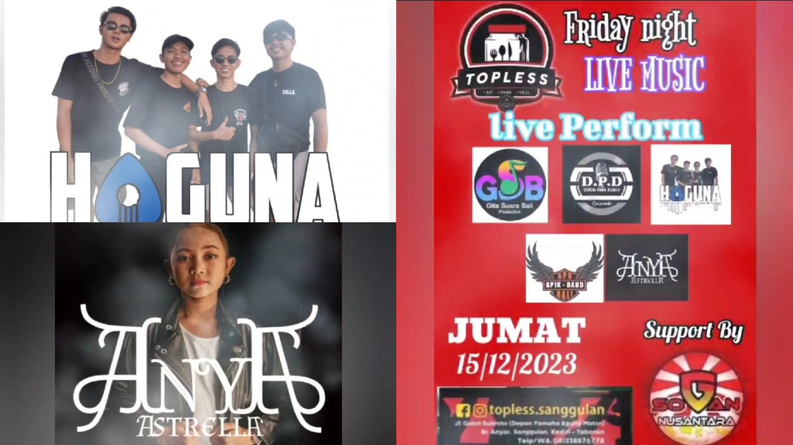 Kolase foto: Banner Friday Night Live Music Perfomance di Warung Topless, Sanggulan (BB/GA)