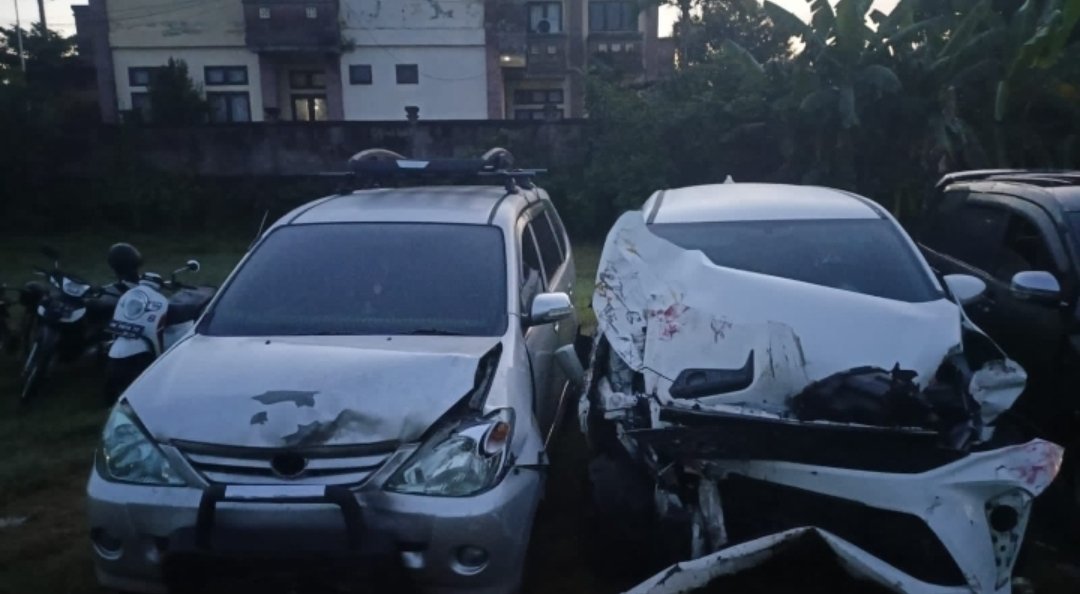 Foto: Kondisi mobil jenis Daihatsu Xenia P 1079 XT dan mobil Toyota Avanza BG 1541 DA pasca-diseruduk dan diserempet truk Fuso. (BB/213)