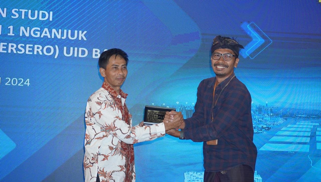 Foto: PLN yang diwakili Pelaksana Harian Manager Administrasi Pelayanan Pelanggan menyerahkan cinderamata kepada pereakilan Guru SMKN 1 Nganjuk. (Sumber: BB/PLN).