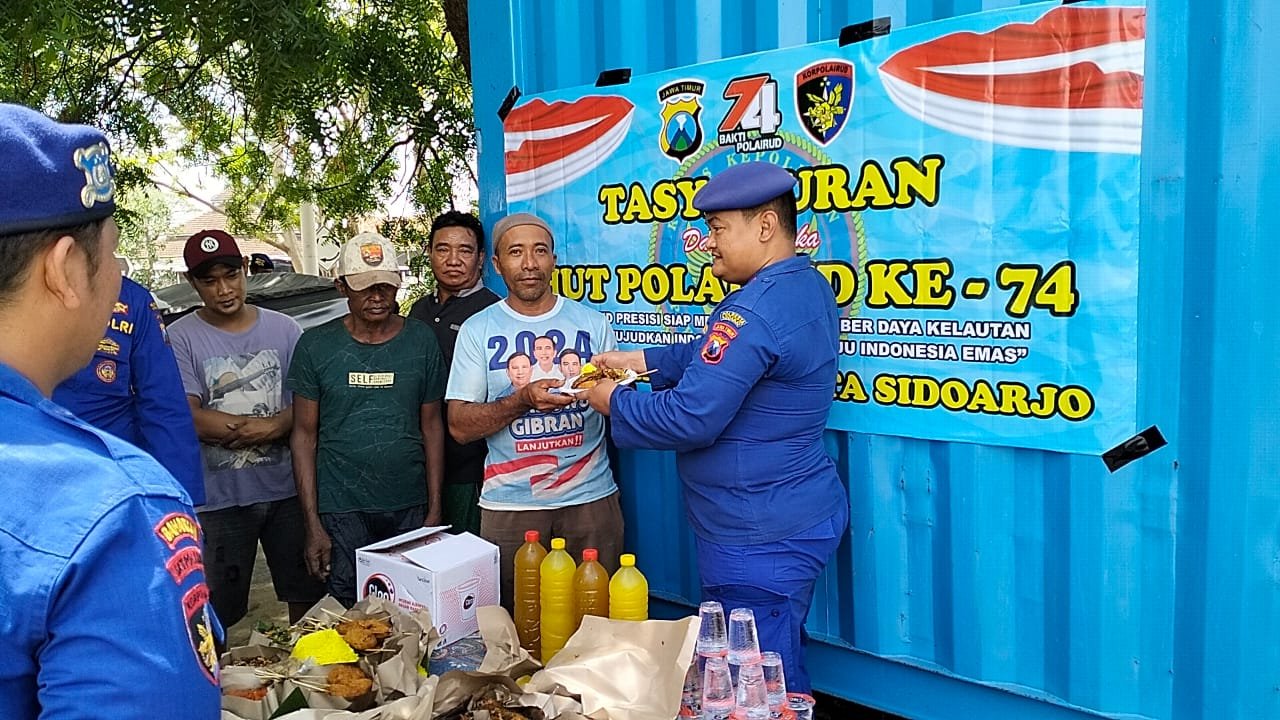 Sidoarjo | barometerbali – Satuan Polairud Polresta Sidoarjo menggelar tasyakuran HUT ke-74 Polairud bersama nelayan di Pos Pantau Dermaga Sungai Tlocor, Jabon, Sidoarjo, Rabu (4/12/2024).