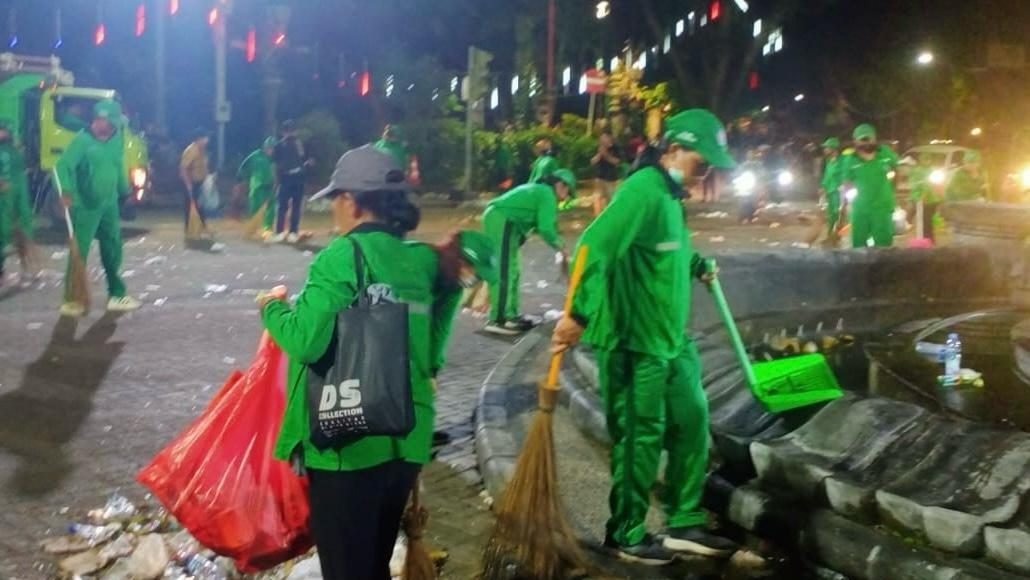 Foto : Tenaga Kebersihan DLHK Kota Denpasar saat bertugas usai Pengarakan Ogoh-ogoh Malam Pengerupukan serangkaian Nyepi Caka 1947 di Kota Denpasar, Jumat (27/3) dini hari. (barometerbali/ags/rah)