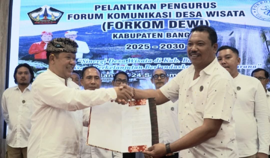 Barometer Bali | Bangli – Bupati Bangli Sang Nyoman Sedana Arta secara resmi melantik pengurus Forum Komunikasi Desa Wisata (Forkomdewi) Kabupaten Bangli periode 2025-2030. Dengan mengusung Tema “Sinergi Desa Wisata di kabupaten Bangli menuju Pariwisata Berkelanjutan berlandaskan Tri Hita Karana”. Acara pelantikan berlangsung di Gedung Bhukti Mukti Bakthi Kantor Bupati Bangli pada Rabu, (24/9/2025).