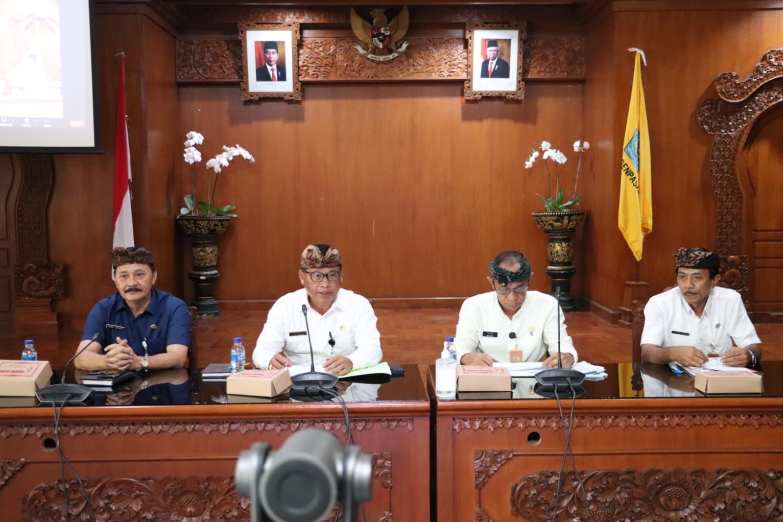 Foto: Sekda Kota Denpasar, Ida Bagus Alit Wiradana bersama Asisten Perekonomian dan Pembangunan Sekda Kota Denpasar, A.A Gde Risnawan, Asisten Administrasi Umum Sekda Kota Denpasar, I Dewa Nyoman Semadi saat membuka Forum Perangkat Daerah Sekretariat Daerah Kota Denpasar Tahun 2024 yang digelar secara online dan offline, Kamis (22/2) di Ruang Praja Utama, Kantor Walikota Denpasar. (Sumber: BB/hmsdps)