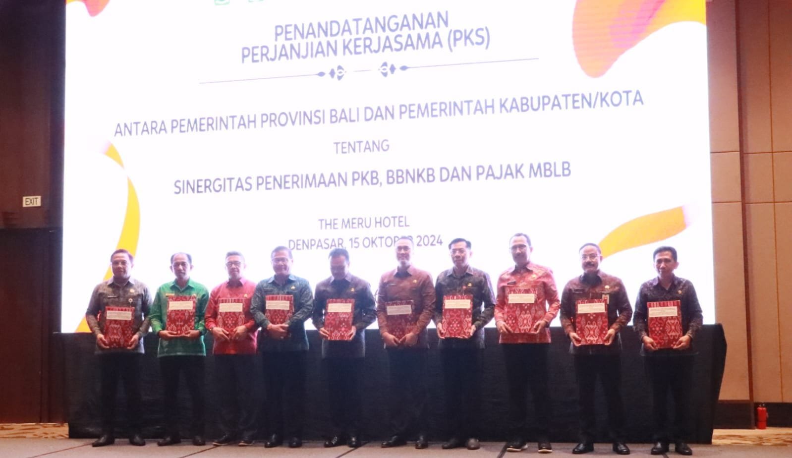 Denpasar | barometerbali – Pelaksanaan penandatanganan Perjanjian Kerja Sama (PKS) terkait sinergitas penerimaan Pajak Kendaraan Bermotor (PKB), Bea Balik Nama Kendaraan Bermotor (BBNKB), dan Pajak Mineral Bukan Logam dan Batuan (MBLB) antara Pemerintah Provinsi Bali dan pemerintah kabupaten/kota se-Bali berlangsung pada Selasa, (15/10) di The Meru Hotel, Sanur, Kecamatan Denpasar Selatan.