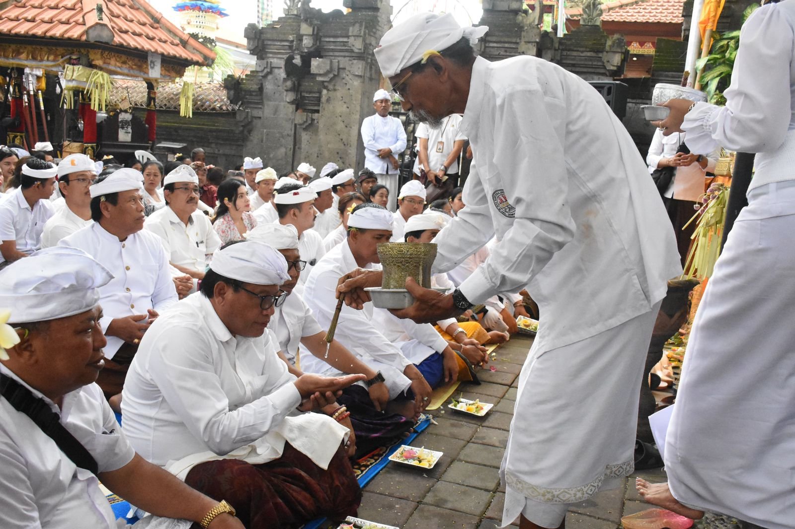 “Dalam pelaksanaan Pujawali Pura Taman Sari yang berlokasi di Desa Dangin Puri Kangin, kita memohon kerahayuan, tuntunan Ida Shang Hyang Widhi Wasa dalam menjalankan swadarma kita masing-masing,” ujar Sekda Alit Wiradana.