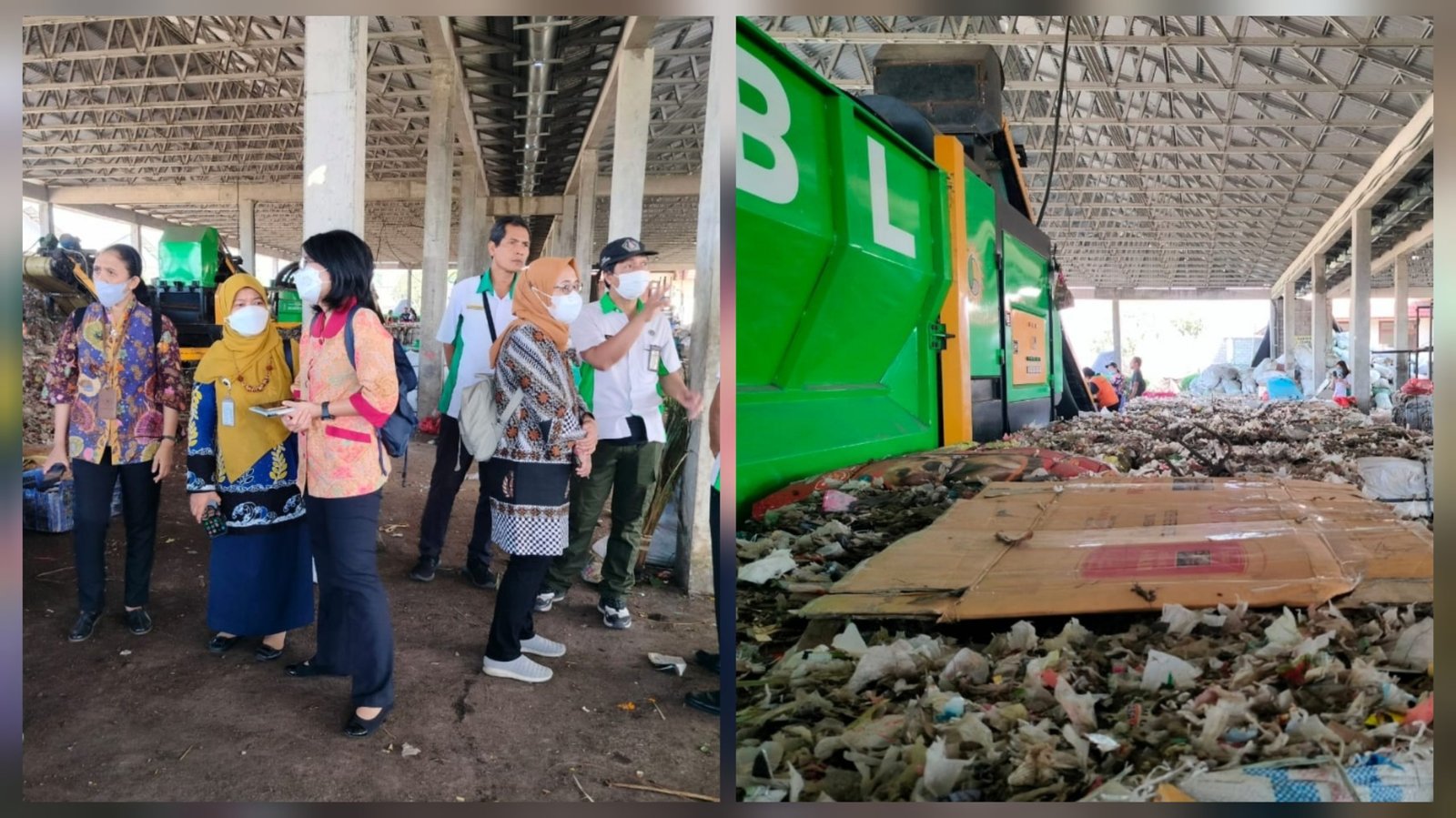 Kolase foto: Asdep Sri Prastiwi Utami (tiga dari kiri) mendengar penjelasan dari dari pejabat Dinas LH Klungkung tentang pengelolaan sampah di TOSS Center Klungkung dan puluhan ton RDF yang dihasilkan mesin RDF dari PT CTBL siap dikirim ke offtaker di Pasuruan Jatim. (Sumber: J2PS)