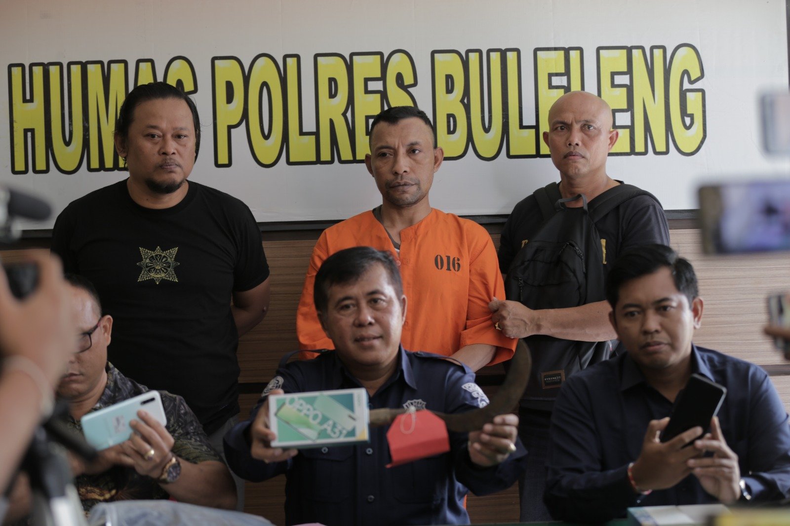 PONSEL: Kasi Humas Polres Buleleng AKP I Gede Sumarjaya (tengah) menunjukkan barang bukti ponsel dan tersangka Aditya Sapitra, (42) pelaku perampasan/pencurian dengan kekerasan (curas) saat menyampaikan press release didampingi Kanit Reskrim Polsek Singaraja AKP Gede Darma Diatmika, di Mapolres Buleleng, Selasa (31/1/2023). Foto: hms/polres bllg/gs