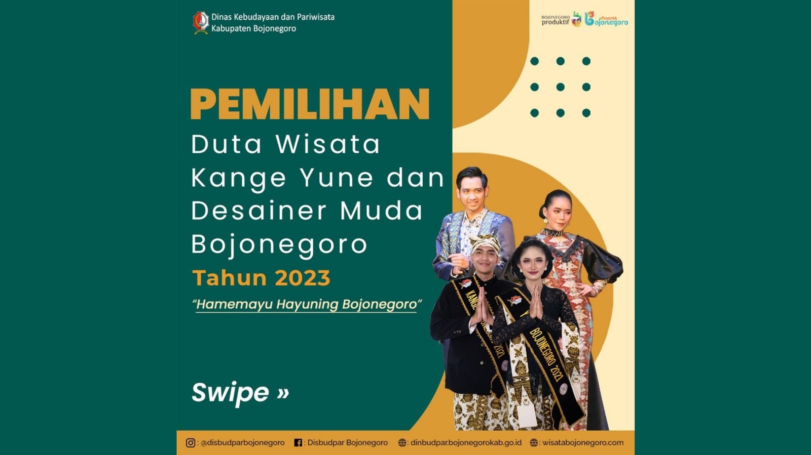 Petunjuk Teknik Pemilihan Duta Wisata Kange Yune dan Desainer Muda Bojonegoro 2023 : https://s.id/jukniskangyudesainermuda