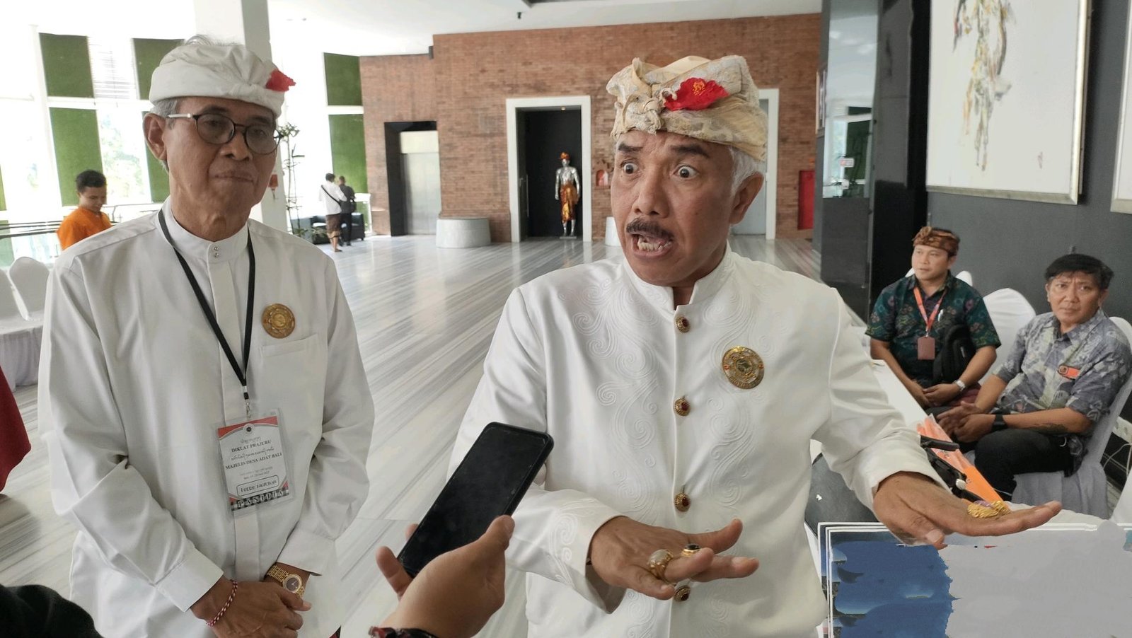 Foto: Ketua MDA Bali Ida Panglingsir Agung Putra Sukahet (kanan) didampingi Ketua Panitia Diklat Prajuru Majelis Desa Adat (MDA) se-Bali 2023 Gede Nurjaya di Hotel Harris, Kuta, Selasa (20/6/2023). (BB/Ngurah Dibia)