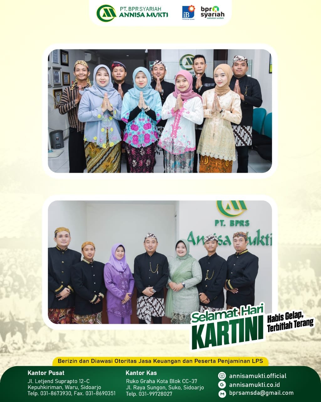 Sebagai bentuk kepedulian atas jasa pahlawan R.A Kartini, peringatan hari Kartini kali ini diharapkan mampu menciptakan Kartini Kartini Bank Syariah Annisa Mukti yang mampu mendukung visi menjadi mitra terpercaya dengan jasa layanan yang lebih prima.