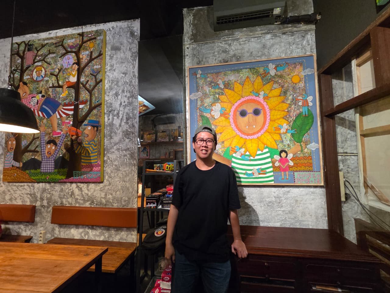 Namun, dorongan dari teman-teman membuatnya perlahan kembali ke ruang publik. Awalnya ia hanya diminta menghias dinding sebuah coffee shop (Kopi Ruko) yang sempat tutup pasca-pandemi. Dari situlah muncul ide kolaborasi seni, musik, dan ruang kopi yang akhirnya menjebaknya kembali ke dunia pameran.