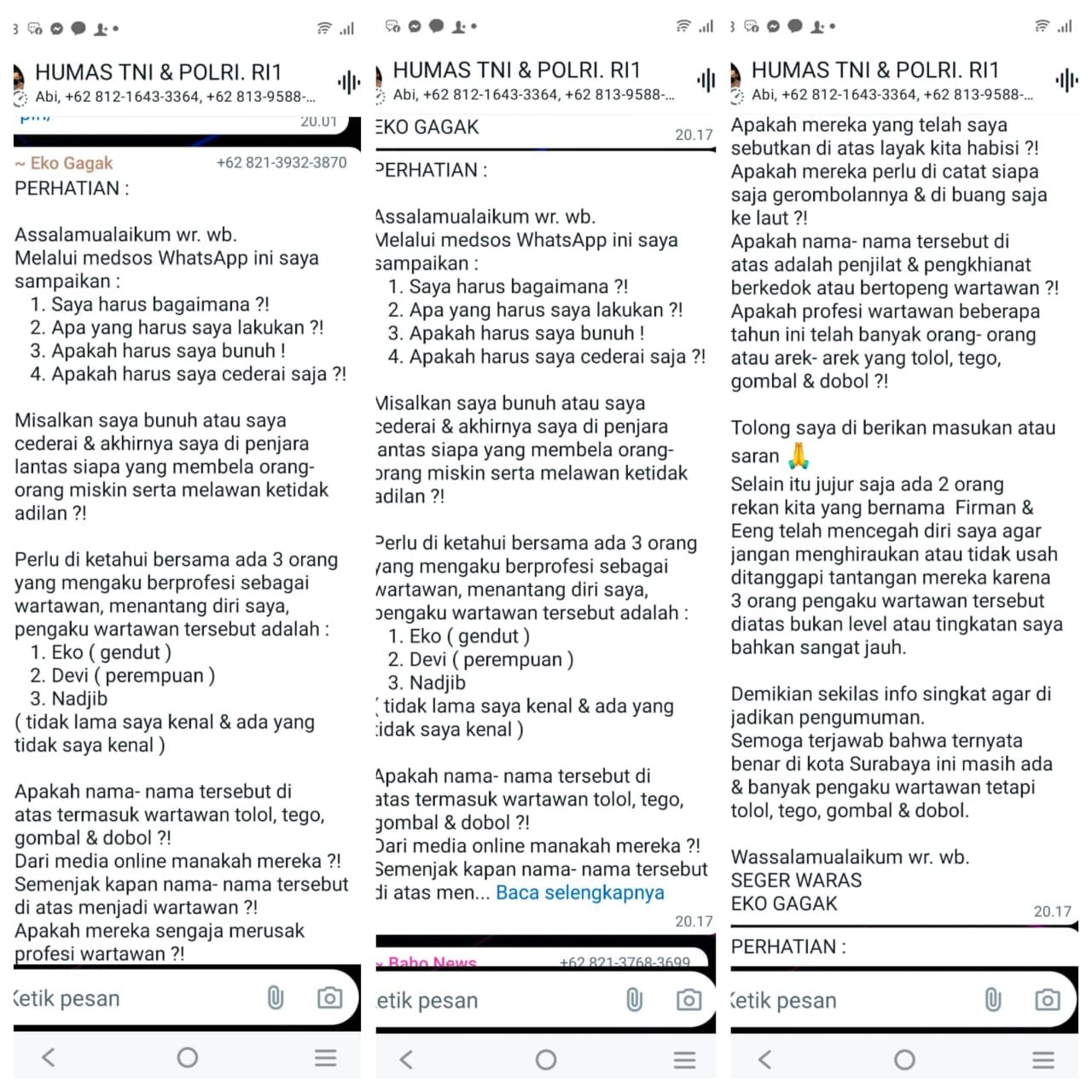 Tidak hanya perkataan Eko Gagak juga melakukan pengancaman di salah satu group whatsapp Humas TNI & Polri, RI 1 dan Berita Kriminal Indonesia yang di grup tersebut ada banyak jurnalis se-Jatim bahkan jurnalis se-Indonesia.
