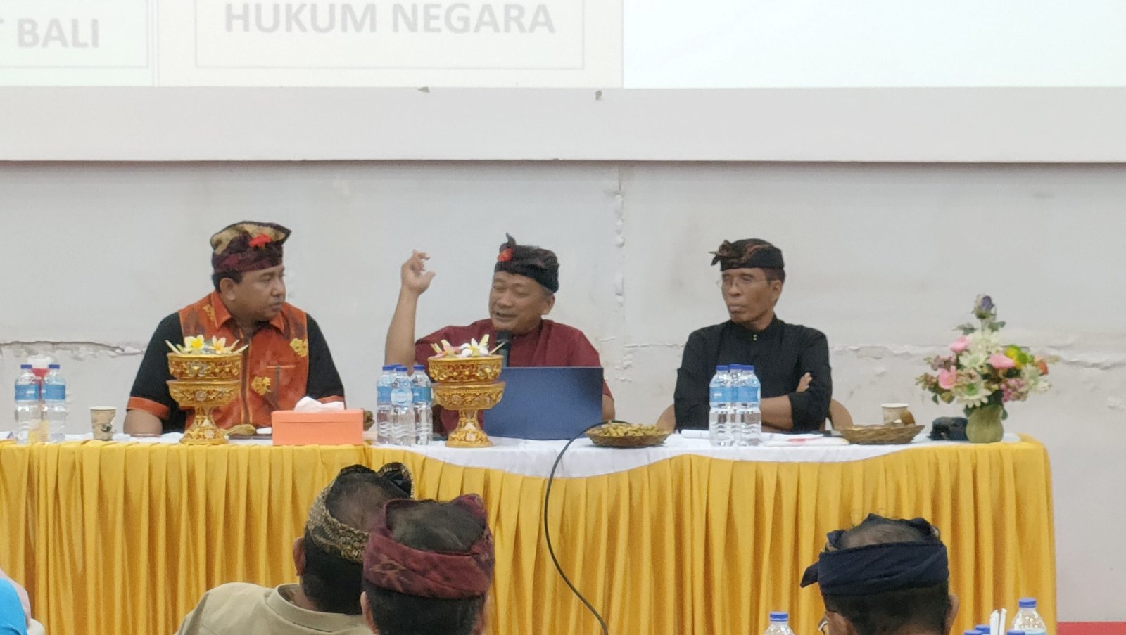 Desa Adat Sukawati melaksanakan pengayaan khazanah dalam Wah wuhin Awig-awig Desa Adat Sukawati menghadirkan narasumber utama Patajuh Bandesa Agung Bidang Kelembagaan dan Sumber Daya Manusia Majelis Desa Adat (MDA) Provinsi Bali Dr Made Wena (tengah) didampingi Penghulu Sabha Desa Adat Sukawati I Made Arya Amitaba, SE, MM, (kiri) dan Bandesa Adat Sukawati Ir I Made Sarwa, MBA, (kanan) di Pusdiklat BPR Kanti, Batubulan Gianyar, Minggu (30/4/2023). (Foto: BB/Db)