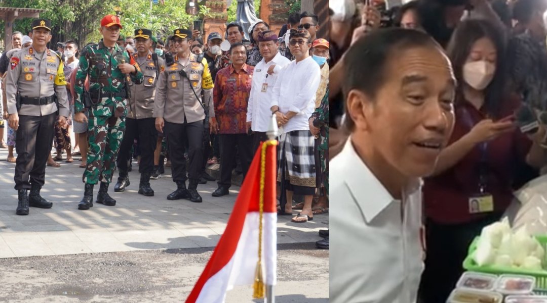 TNI-Polri bersinergi mengamankan kunjungan kerja Presiden Jokowi di Pasar Badung, Kamis (17/11/2022) pagi. (Kolase foto/polda/bali/ist)