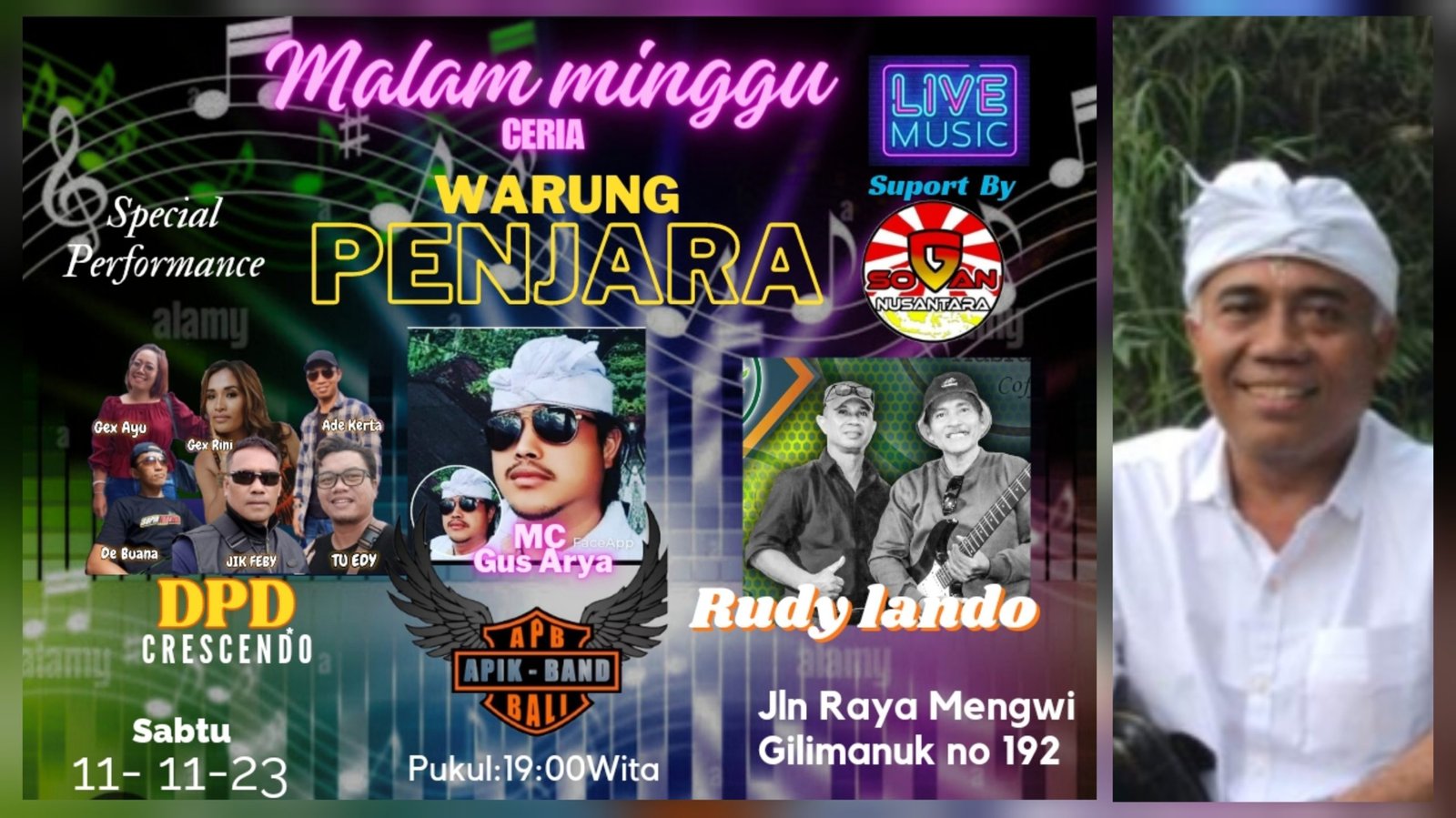 Acara live music ini bakal dimeriahkan dengan penampilan, special performance group band DPD (Demen Pada Demen) Crescendo, Apik Band (APB), dan Rudi Lando dipandu MC Gus Arya dalam event bertajuk “Malam Minggu Ceria di Warung Penjara”.