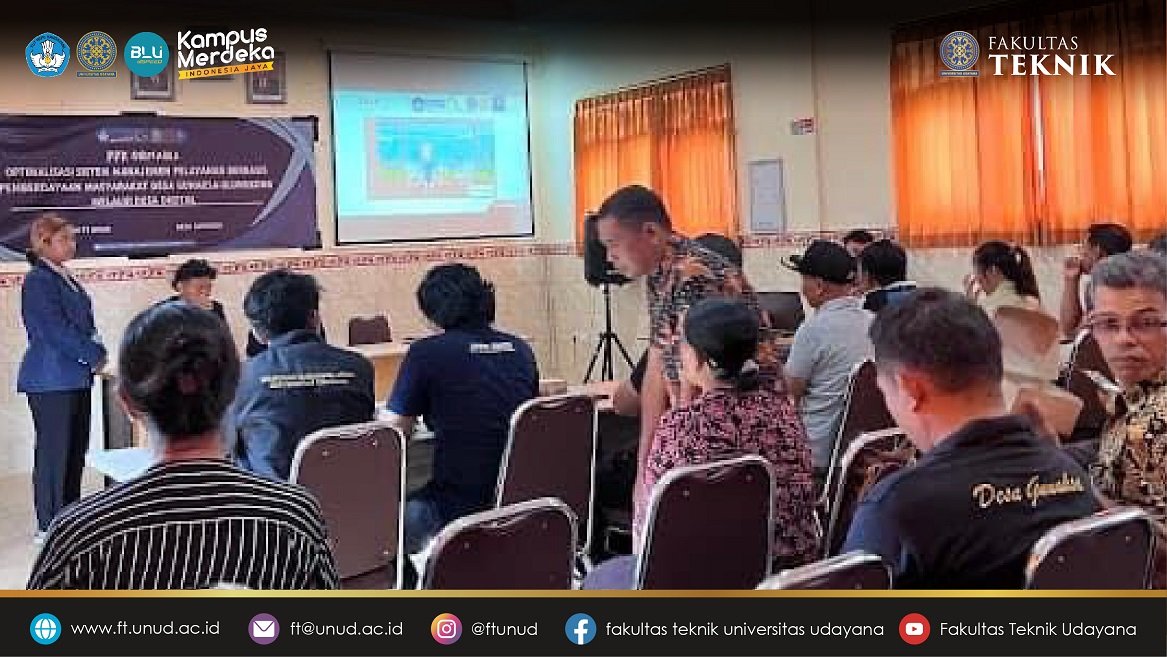 Sosialisasi Dihadiri oleh Wakil Dekan Bidang Kemahasiswaan dan Sistem Informasi Fakultas Teknik Universitas Udayana Bapak I Gusti Ketut Sukadana, ST., MT, Dosen Pembimbing, Bapak Dr. Ir. Wayan Nata Septiadi, ST., MT, Ketua Himpunan Mahasiswa Mesin Fakultas Teknik Universitas Udayana, Tim PPK-Ormawa, Perbekel Desa Gunaksa Bapak I Wayan Sardiana, SH, Sekdes Desa Gunaksa, KADUS, Duta Digital Kabupaten, Perangkat Desa dan Perwakilan.