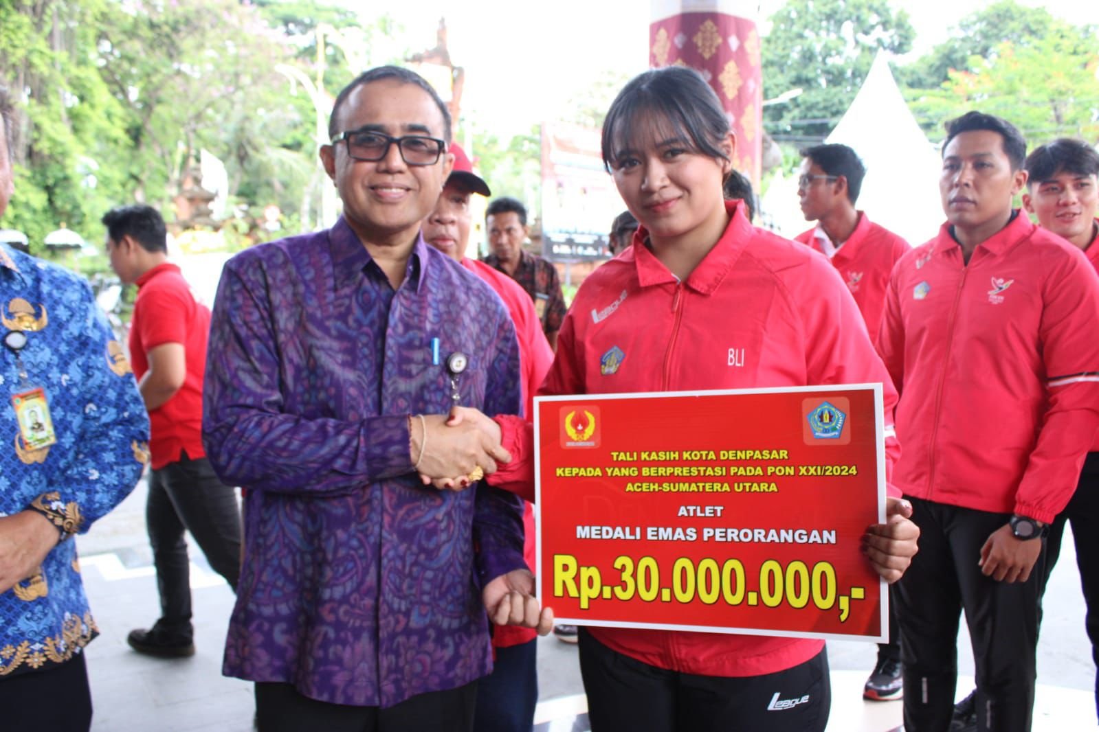 Bonus itu untuk peraih medali pada PON Aceh dan Sumatera Utara, September 2024 lalu. Dalam kesempatan hadir pula Sekda Kota Denpasar, IB. Alit Wiradana didampingi Ketua Umum KONI Kota Denpasar, Ida Bagus Toni Astawa.