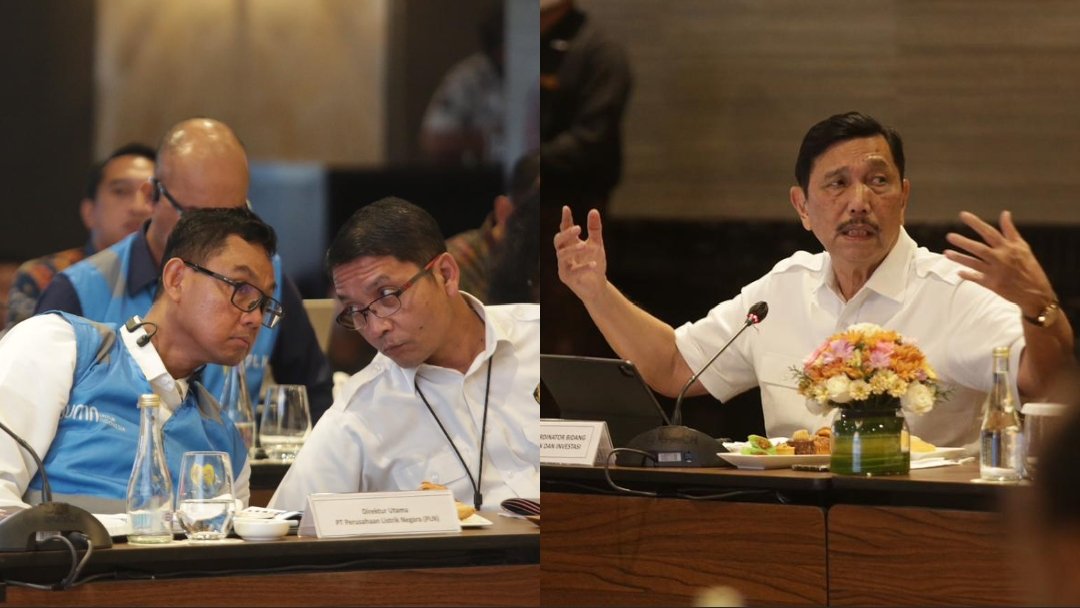 Ket foto: Direktur Utama PLN Darmawan Prasodjo (kiri) mendengarkan arahan Menko Marves Luhut Binsar Pandjaitan (kanan) meminta seluruh persiapan matang pada pekan kedua Oktober dalam Rakor KTT G20 di Nusa Dua, Bali, Selasa (4/10/2022) (ist/pln)