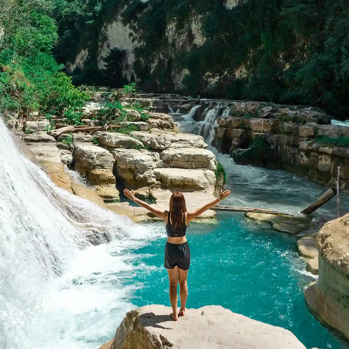 Airnya yang biru bersih membuat air terjun ini sangat indah.