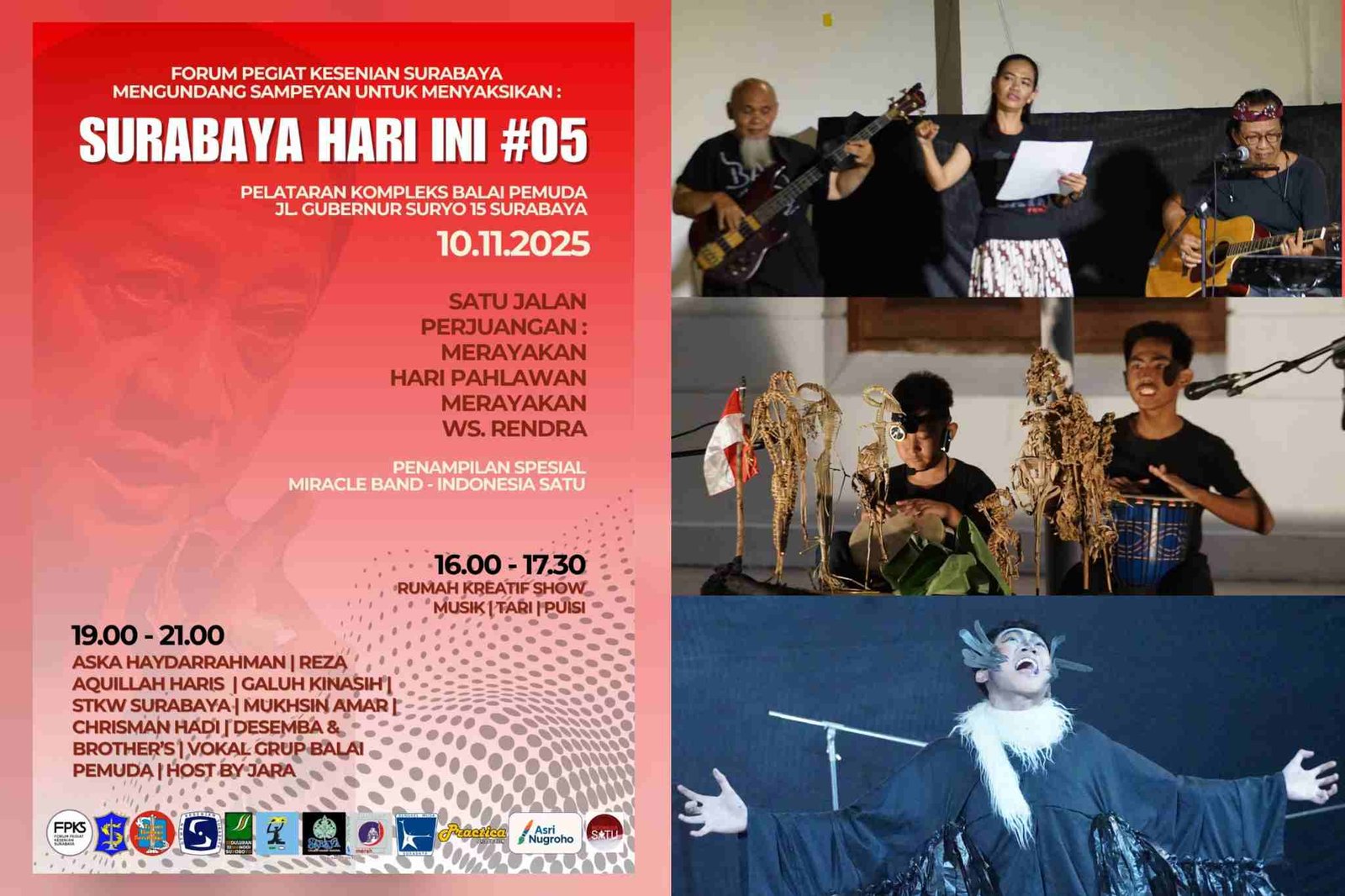 Barometer Bali | Surabaya – Satu Jalan Perjuangan : Merayakan Hari Pahlawan sekaligus merayakan WS. Rendra menjadi tema pagelaran “Surabaya Hari Ini” ke-5 yang diadakan Forum Pegiat Kesenian Surabaya (FPKS) pada tanggal 10 November besok, mulai pukul 16.00 hingga 21.00, di Teras Dewan Kesenian Surabaya, Kompleks Balai Pemuda, Jl. Gubernur Suryo 15 Surabaya.
