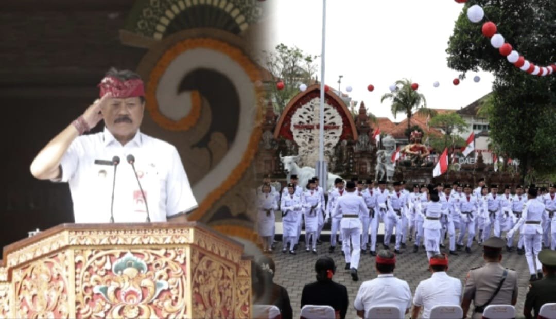 Membacakan sambutan Gubernur Bali, Wabup Dirga menyampaikan rasa syukur atas perjalanan panjang Provinsi Bali sejak 1958, yang dibangun dengan semangat perjuangan dan dedikasi para pemimpin terdahulu. Periode pembangunan 2018–2023 berhasil mencetak 44 tonggak peradaban penanda Bali Era Baru, termasuk pengesahan UU Nomor 15 Tahun 2023 tentang Provinsi Bali yang mengakui desa adat, subak, sat kerthi kebudayaan, dan kearifan lokal.