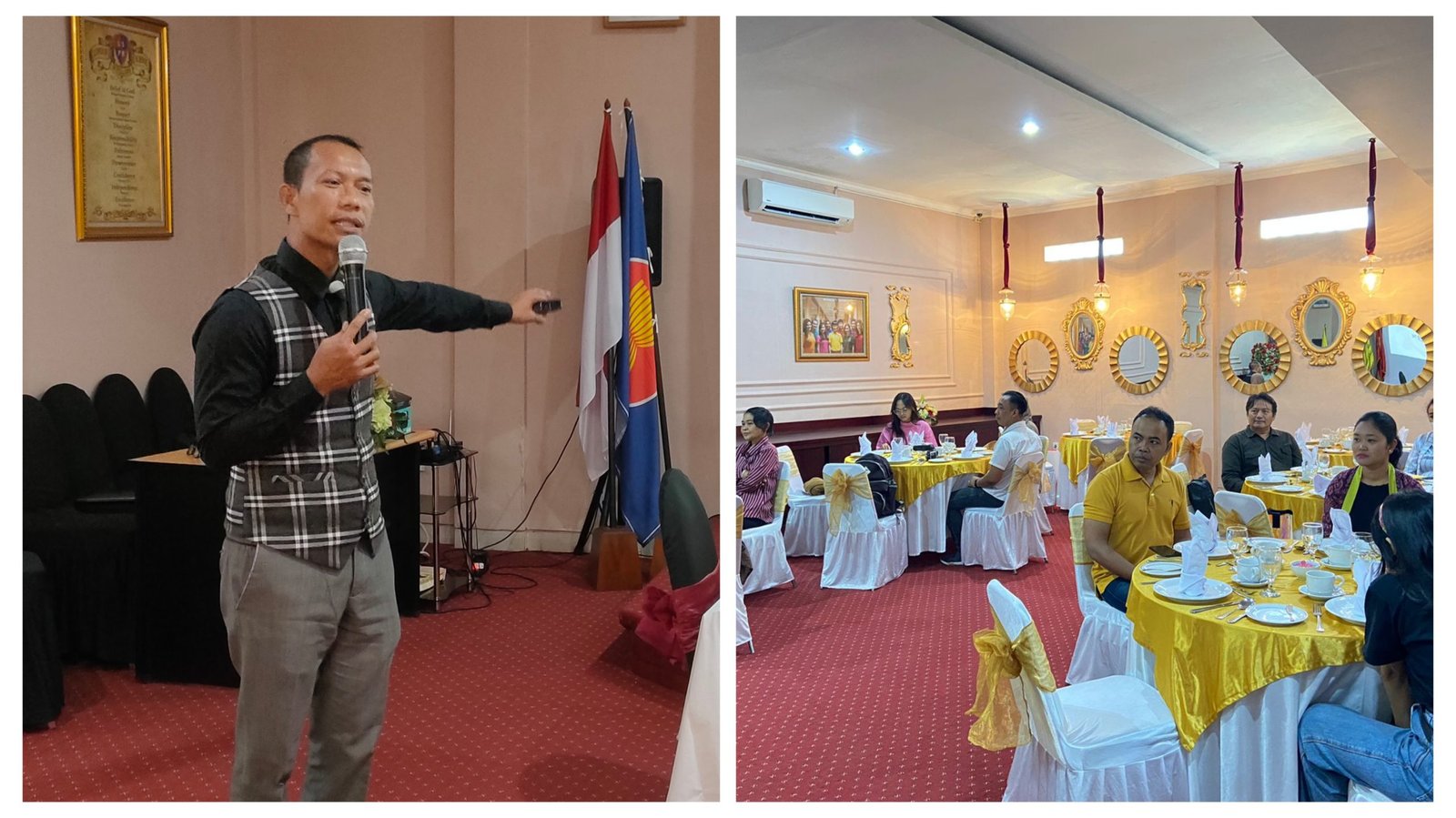 Kolase: London School of Public Relations (LSPR) Institute menggelar Pelatihan Table Manner atau etika makan yang baik dan benar diikuti 20 wartawan menghadirkan narasumber ahli Dr. Firman Sinaga, SST.Par.M.Si.Par.,Par.,CHT (kiri) di Auditorium LSPR Bali, Kamis (4/5/2023). (BB/Ngurah Dibia)