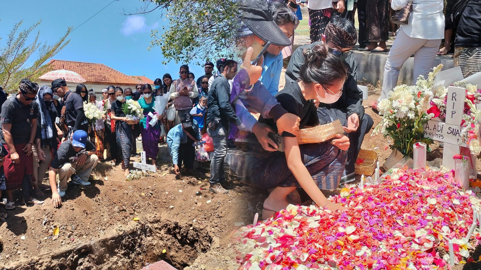 Kolase foto: Ayu Mayla bersama keluarga menaburkan bunga pada upacara pemakaman almarhumah ibunya, Ida Ayu Adi Swandewi (49) di Taman Makam Mumbul, Nusa Dua, Selasa (10/9/2024). (Sumber: barometerbali/aym)